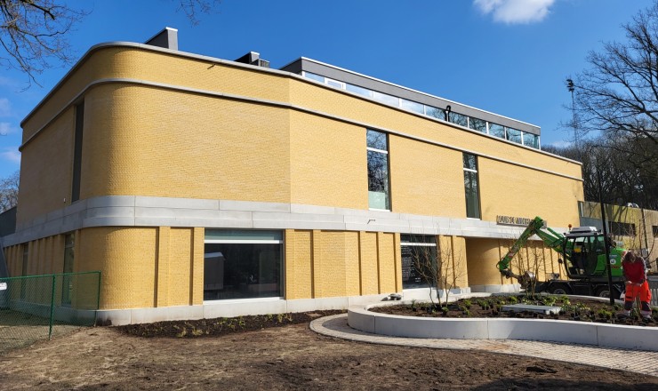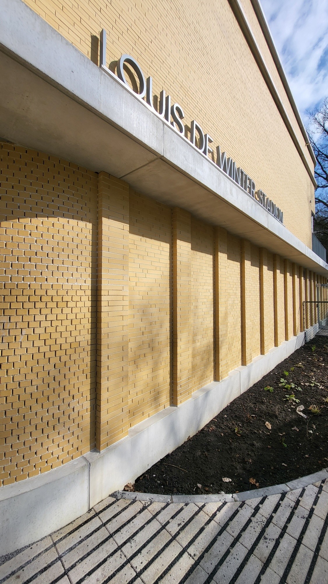 De gevelstenen zijn zachtgeel, in de massa gekleurd, met lichte onregelmatigheden.