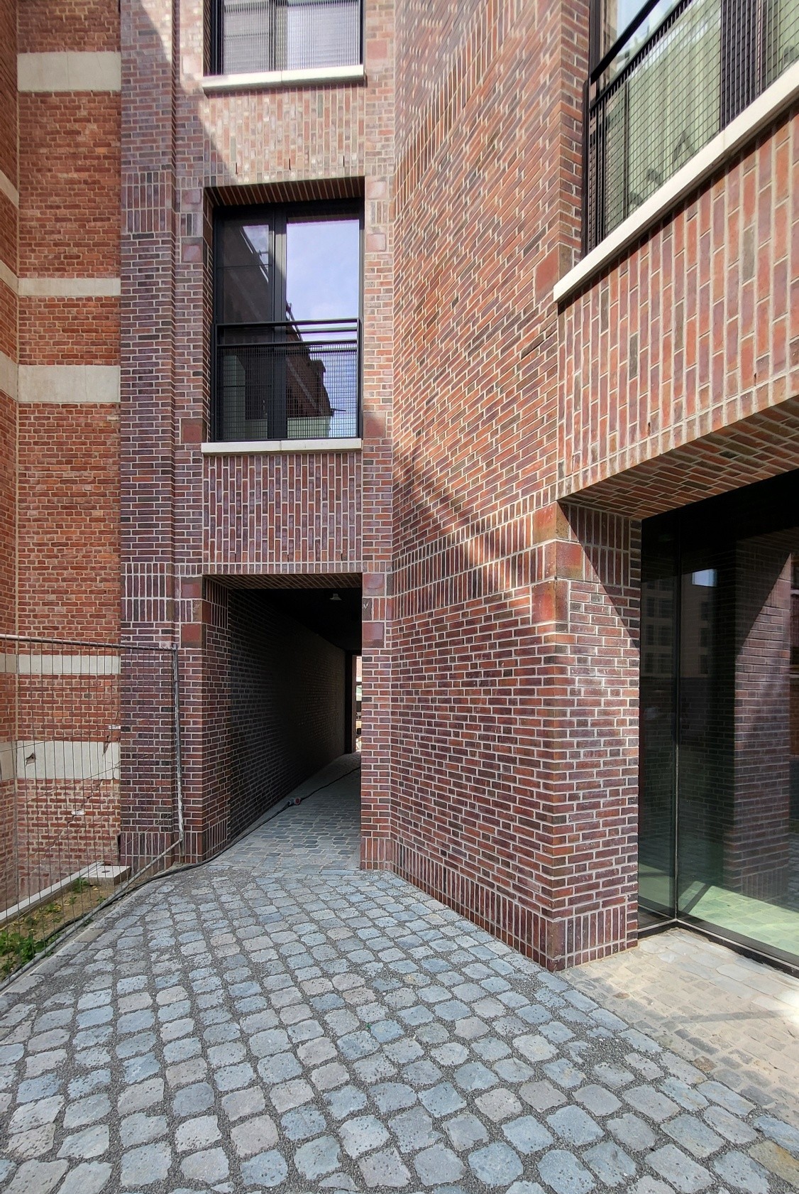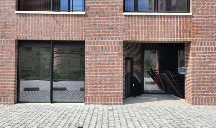 De gevelstenen zijn rood met bronskleurige, groengrijze, antracietgrijze en paarse nuanceringen, in de massa gekleurd.
